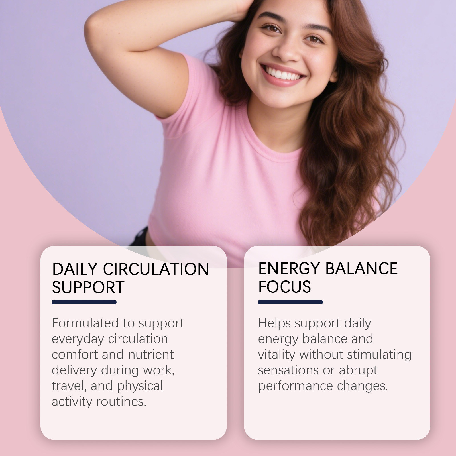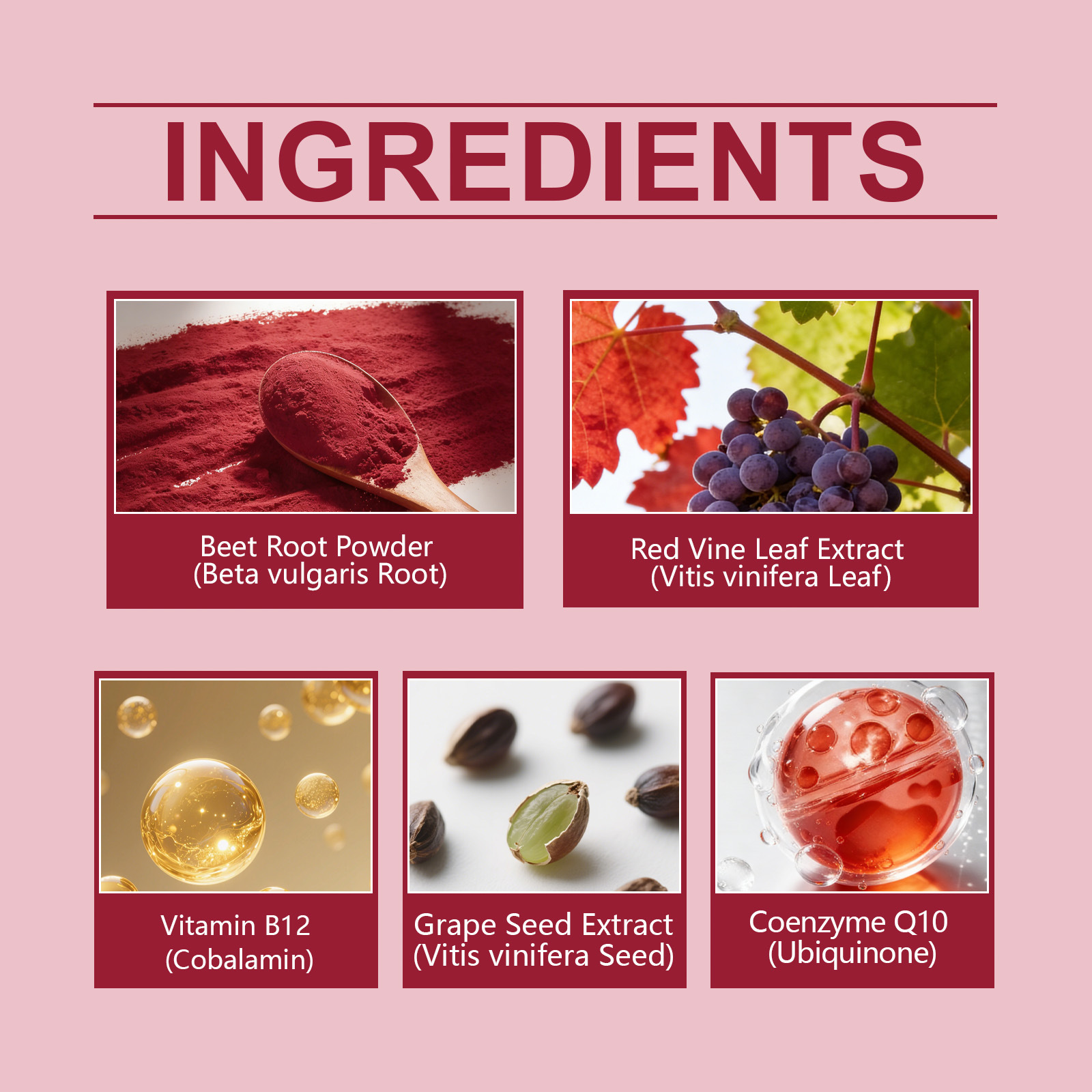 Ingredients: vitamin B12, beet root powder, red vine leaf extract, grape seed extract, coenzyme Q10.