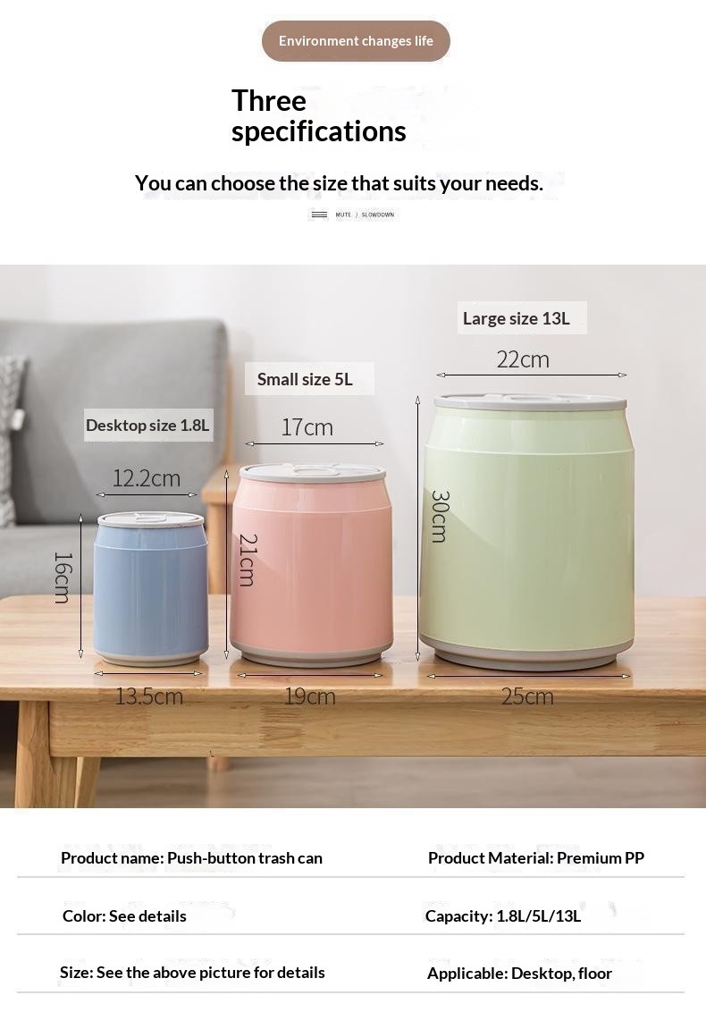 Sizes: Large—13 liters (suitable for the living room or bathroom); Medium—5 liters (ideal for kitchen countertops); Small—1.8 liters (solid-color countertop model, color selected at random)
